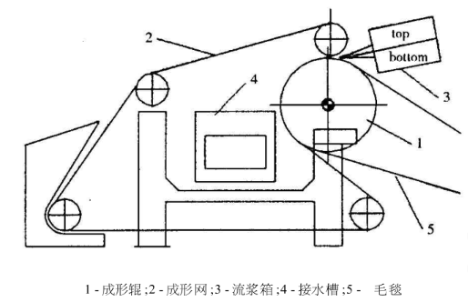 1-Forming Roll; 2-Forming Fabric; 3-Headbox, 4-Water tank; 5-Paper making felt;